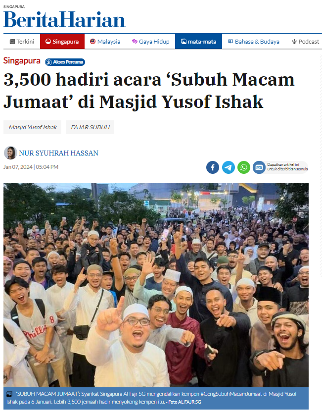 3,500 congregants attended ‘Subuh Macam Jumaat’ at Masjid Yusof Ishak organized by Al-Fajr SG